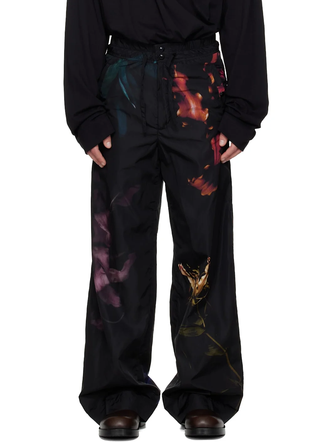 Nylon taffeta trousers. · Floral graphics printed throughout · Drawstring at elasticized waistband · Four-pocket styling · Zip fly Supplier color: Black 100% polyamide. Made in Romania 252358M191014