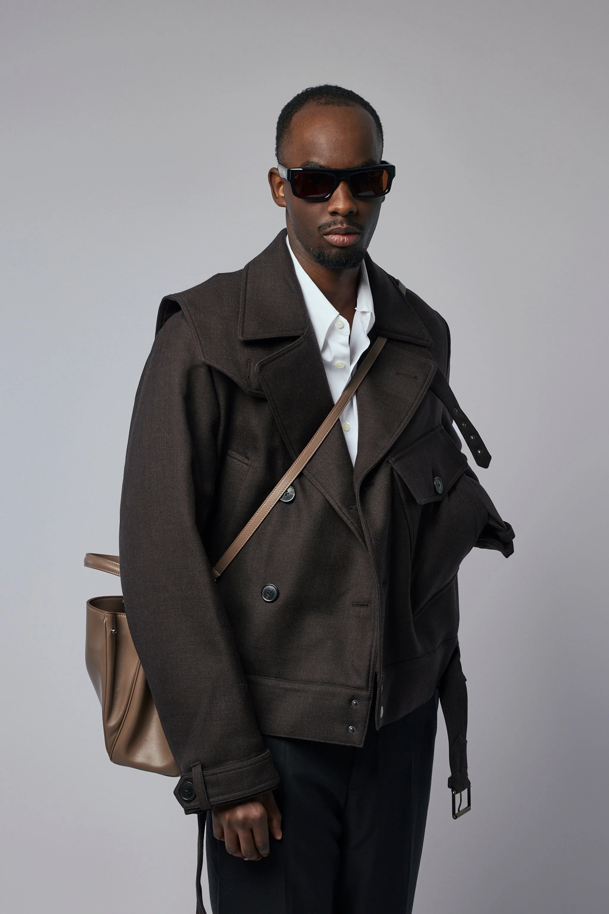 SKU: 152147 Brand style: 252-020568-2058-704 Bomber jacket featuring a structured design with asymmetric button details. The jacket includes wide lapels, a high neck, and a belted waist for a modern aesthetic. - Structured asymmetric design - Wide lapels and high neck - Belted waist - Front button closures - Large front pockets Materials: 100% Wool Color: Dark Brown Relaxed Fit The model is 1.89m (6.2ft) and wears a size M. The item has a looser cut but is not necessarily oversized. It’s intended for a comfortable and easy wear.