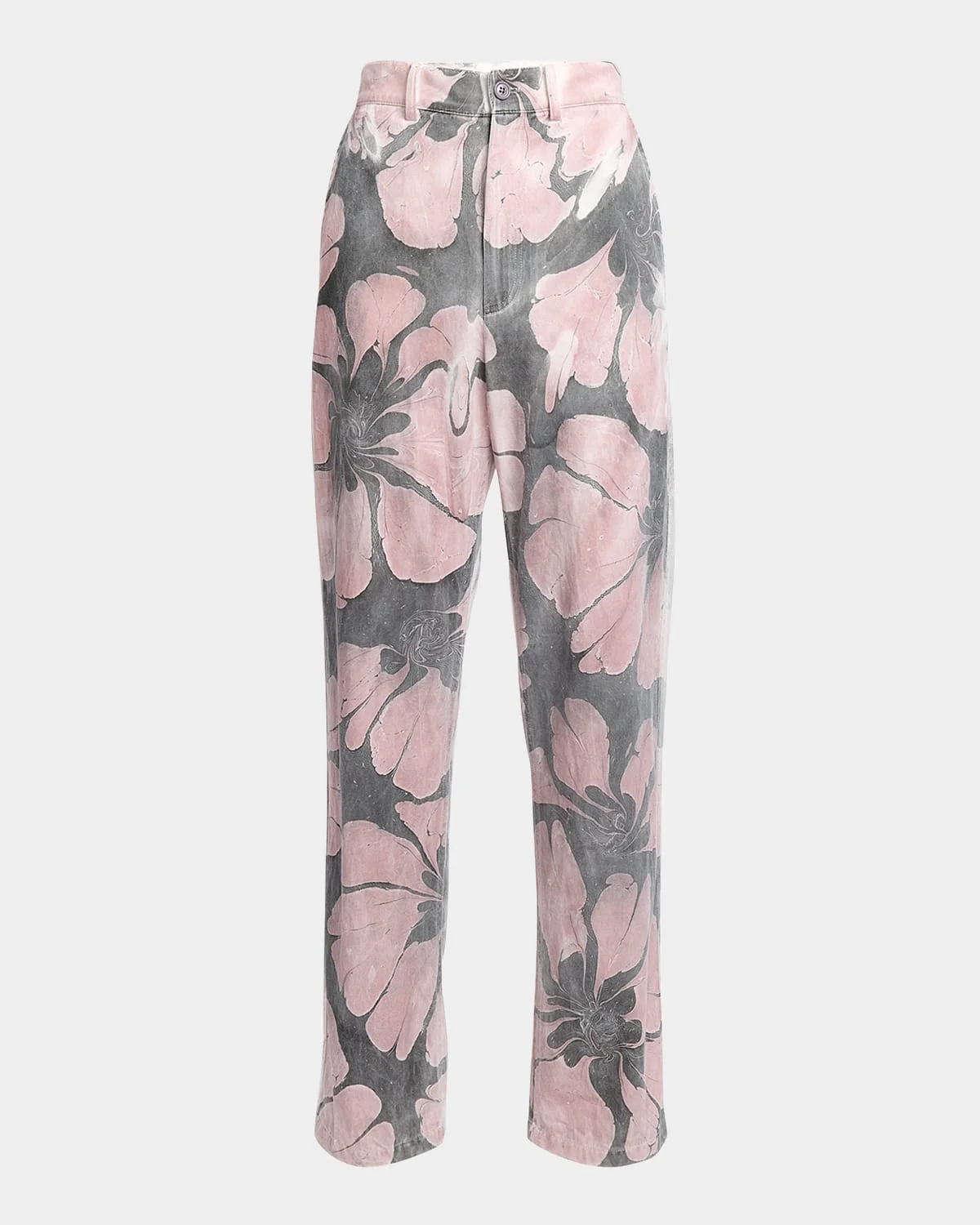 Dries Van Noten "Pynam" pants in white denim with faded floral print on front Regular rise Flat front Side slip pockets Back patch pockets Full length Loose fit through straight legs Button/zip closure; belt loops Cotton Made in Romania