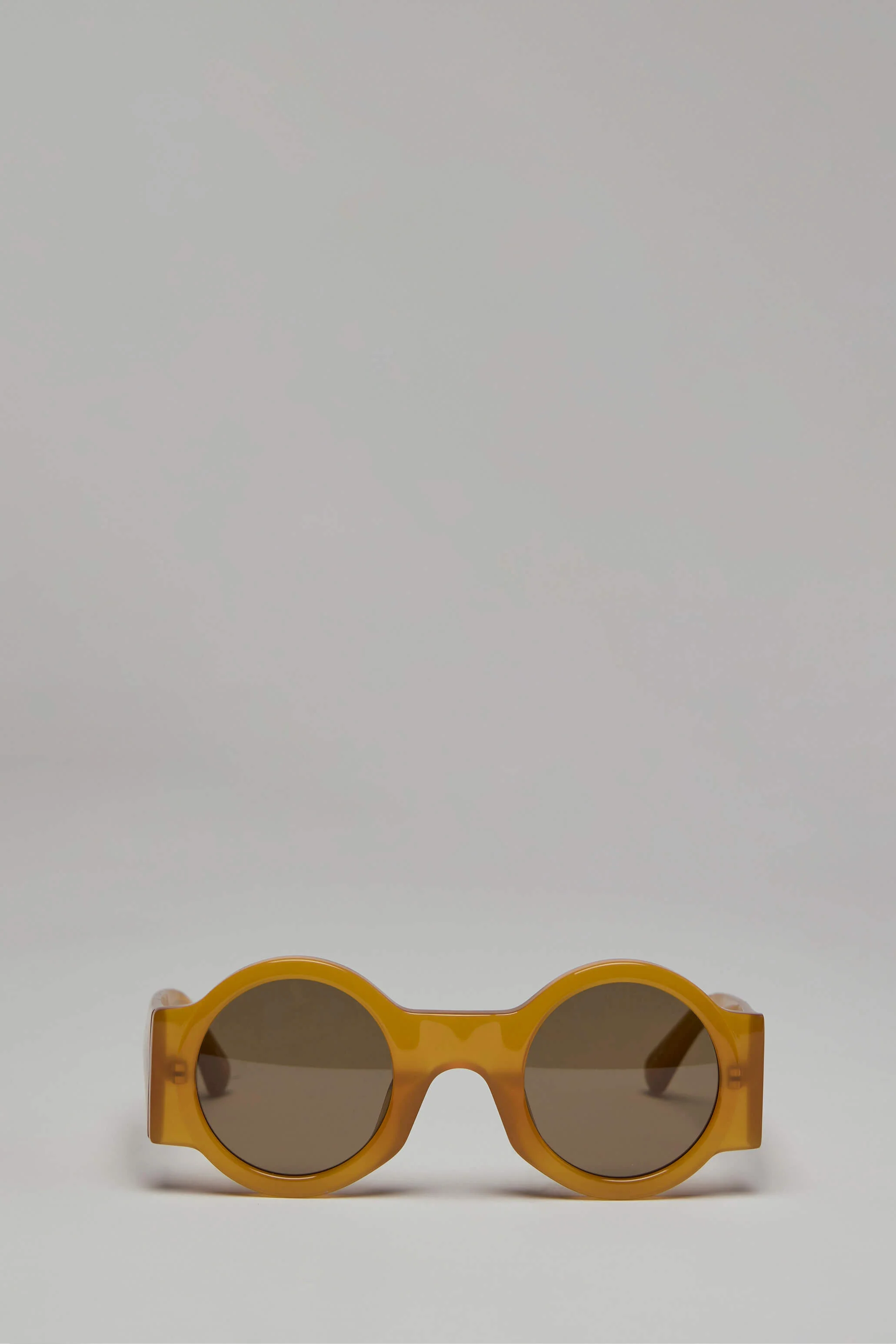 SKU: 153606 Brand style: DVN98 Round sunglasses featuring bold, yellow-tinted frames with dark lenses, offering a stylish and modern look. - Round frame shape - Yellow-tinted frame color - Dark round lenses - Bold design - Visible brand engraving Materials: Color: Honey/ Gold/ Brown