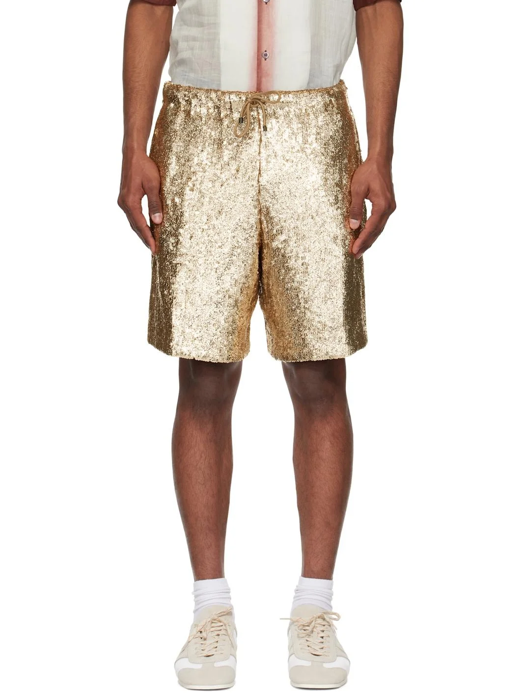 Sequinned viscose gauze shorts. · Drawstring at elasticized waistband · Three-pocket styling · Fully lined Supplier color: Gold 100% viscose. Made in India 252358M193000