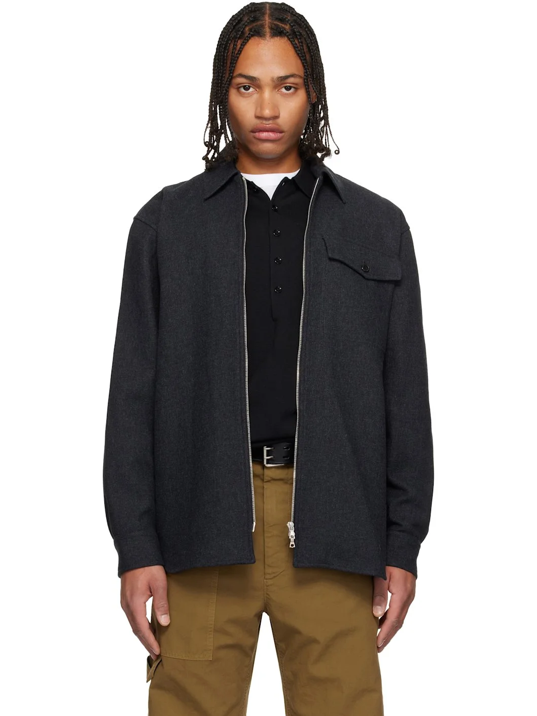 Cotton-blend delaine jacket. · Spread collar · Two-way zip closure · Flap pocket at chest · Shirttail hem · Dropped shoulders · Adjustable buttoned barrel cuffs · Unlined Supplier color: Dark grey 39% cotton, 26% polyester, 18% acrylic, 9% wool, 6% viscose, 2% other fibers. Made in Tunisia 252358M192009