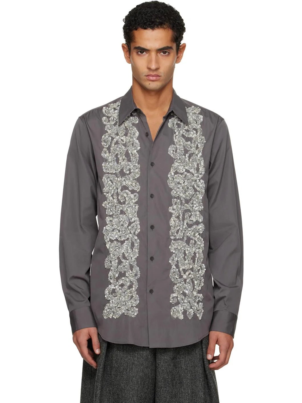 Handcrafted cotton faille shirt. · Spread collar · Button closure · Sequinned detailing at front · Shirttail hem · Adjustable buttoned barrel cuffs Supplier color: Grey 100% cotton. Made in India 252358M192039
