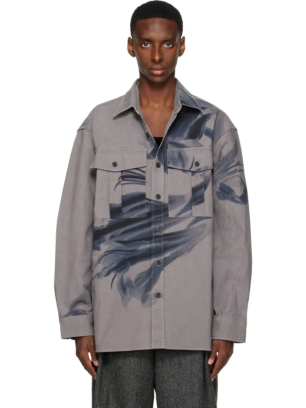 Oversized cotton canvas shirt. · Spread collar · Button closure · Flap pockets at chest · Graphic printed at front and sleeves · Shirttail hem · Dropped shoulders · Adjustable buttoned barrel cuffs Supplier color: Grey 100% cotton. Made in Portugal 252358M192026