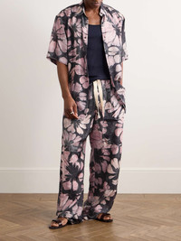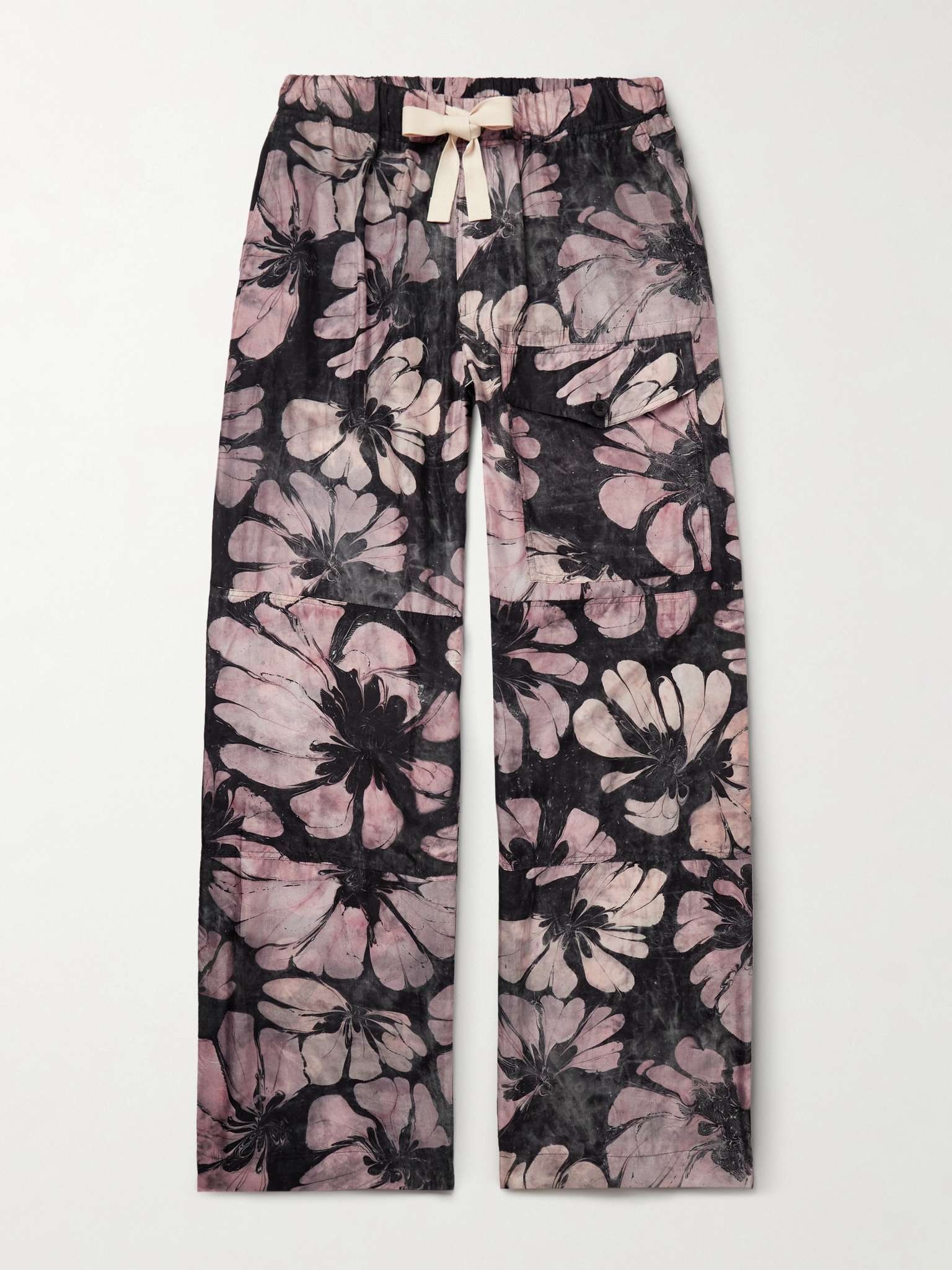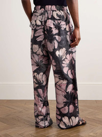 Dries Van Noten's 'Pannoch' trousers combine the comfort of pyjamas with the utility style of cargos. They're cut for a wide-leg fit from floral-print silk-satin and detailed with an elasticated drawstring waistband, articulated knees and a single flap pocket. Size & Fit - Fits true to size. Take your normal size - Wide leg, low-crotch style - Adjustable at the waist - Slightly long in length - Lightweight, non-stretchy fabric - Model is shown wearing an IT 48 - Model measures: waist size 32 Details & Care - Black and pink silk-satin - 100% silk; buttons: 100% horn (Buffalo) - Dry clean