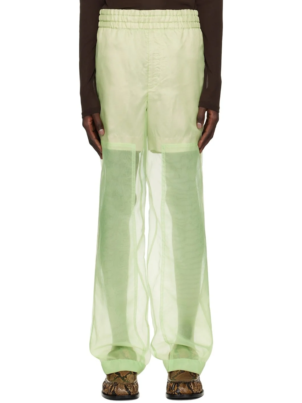 Straight-leg polyester organza trousers. Lightweight and semi-sheer. · Layered construction · Concealed drawstring at elasticized waistband · Four-pocket styling · Zip fly · Partial viscose satin lining Supplier color: Light green Body: 100% polyester. Lining: 100% viscose. Made in Romania 251358M191068