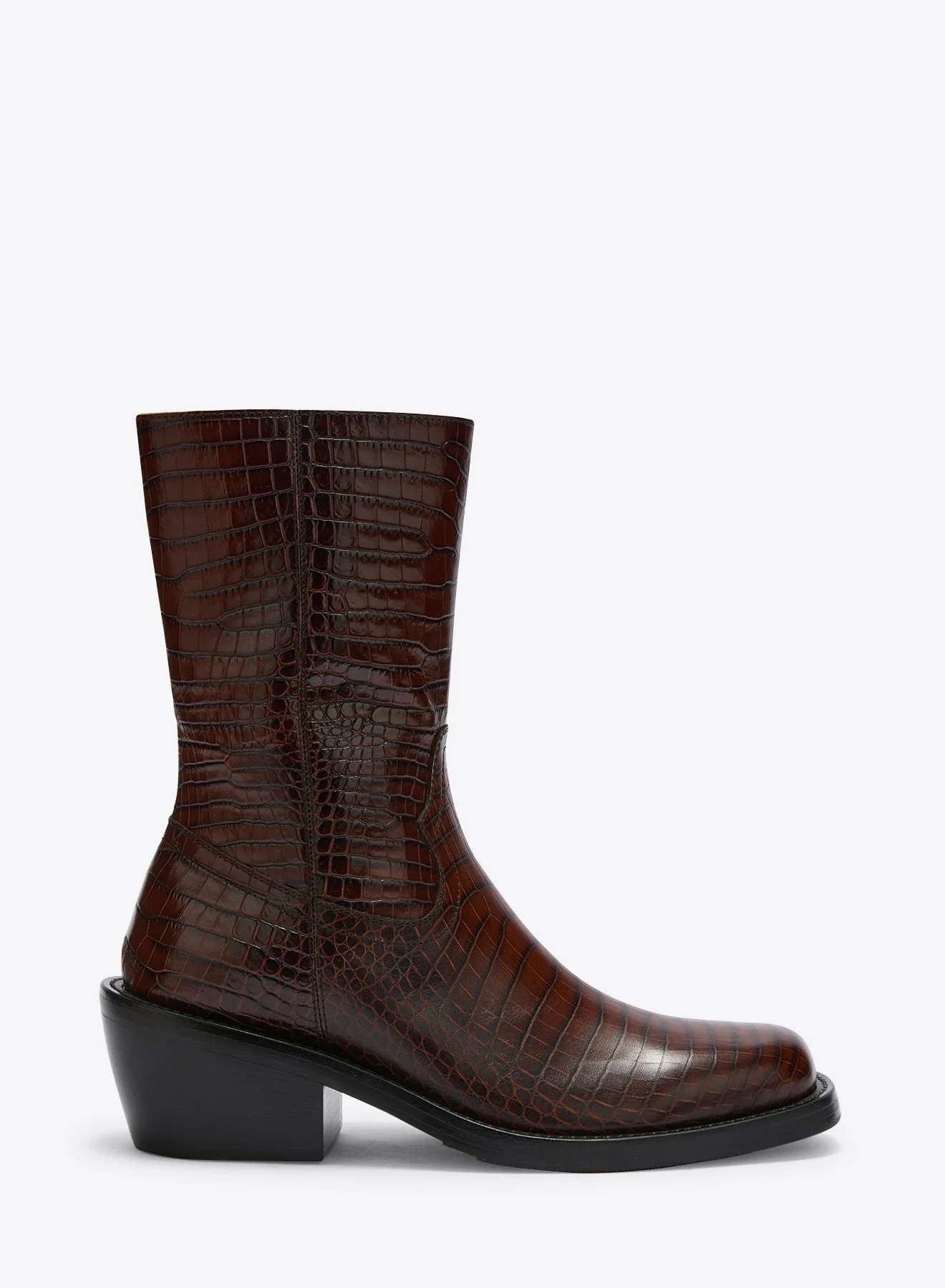 Zip-up boots in embossed leather, with chunky rounded heel and square toe. DETAILS - Upper: 100% Calf Leather. Lining: 100% Calf Leather. Insole: 100% Calf Leather. Sole: 80% Rubber, 20% Calf leather. - Round squared toes. Side zip. - Comes with dust bag. - Made in Italy. - Ref: 261-021706-0598 SIZE AND FIT Heel measures 65 mm / 2.6 in.