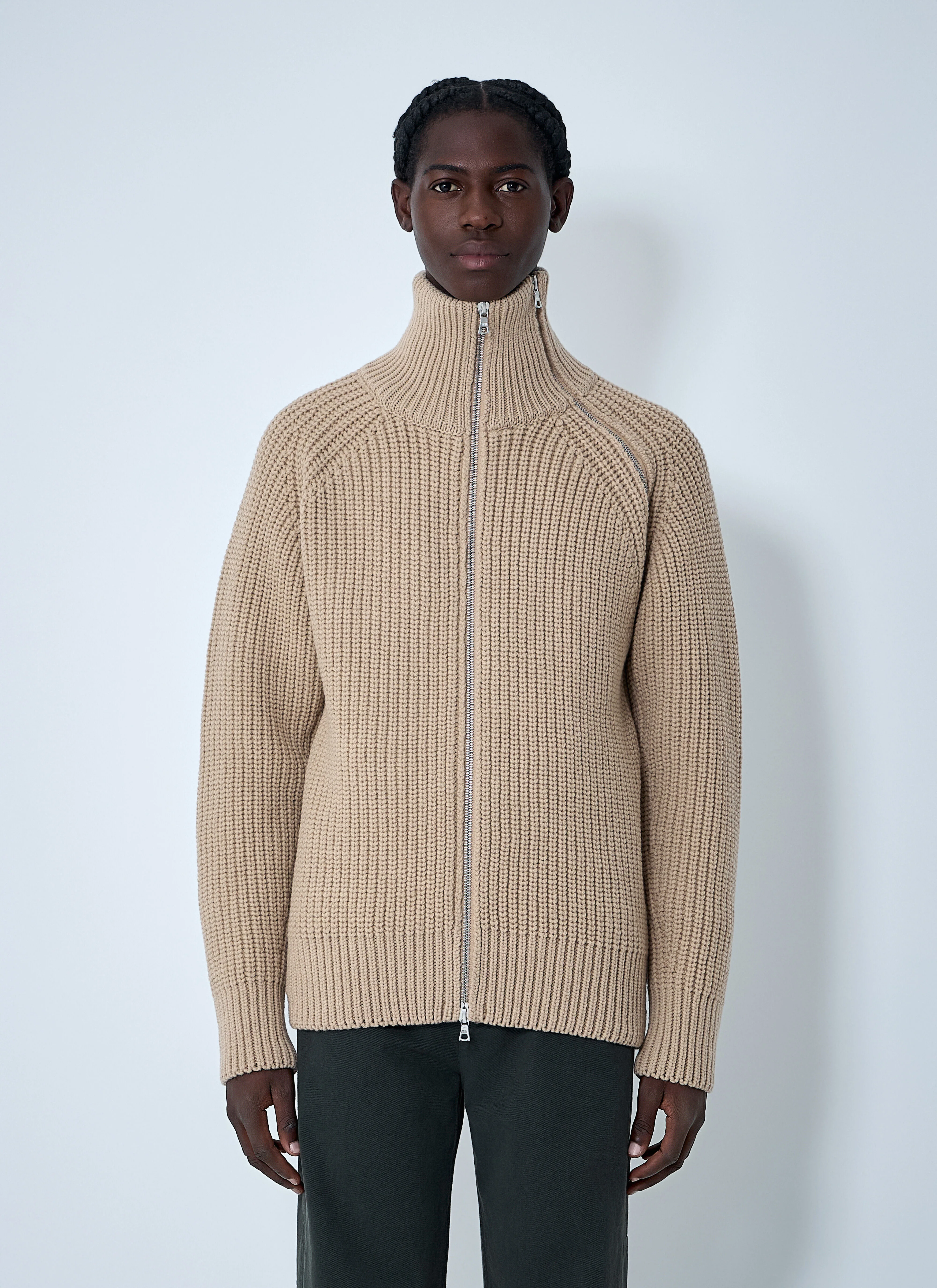Cardigan in wool knit. - Stand collar - Long sleeves - Front zip fastening - Ribbed - 100% Wool. Dry clean - Color: Beige - Code: 252-021217-2707-103
