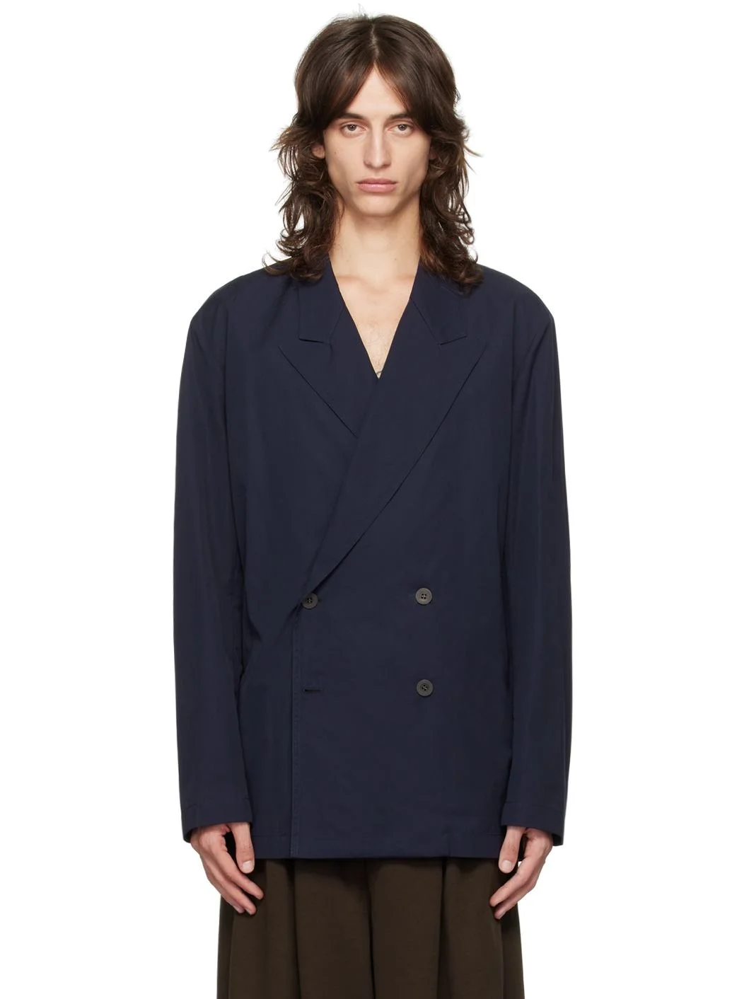 Cotton poplin blazer. · Peaked lapel · Double-breasted button closure · Vented side seams Supplier color: Midnight
