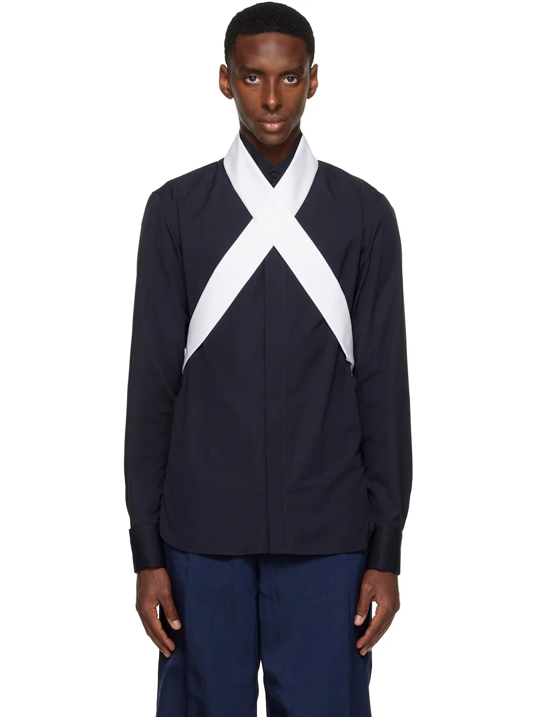 Cotton poplin shirt. Adjustable and detachable crisscrossing strap at front. · Mock neck · Button closure · Shirttail hem · French cuffs Supplier code: Midnight 100% cotton. Made in Hungary 252358M192024