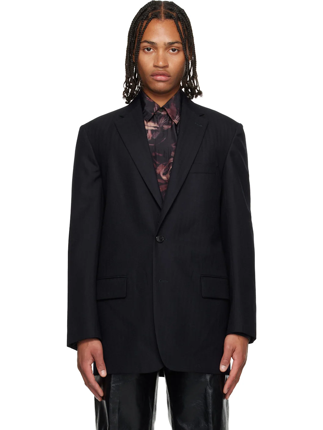 Wool twill blazer. · Herringbone pattern throughout · Notched lapel · Single-breasted button closure · Welt pocket at chest · Flap pockets at waist · Surgeon's cuffs · Central vent at back hem · Welt pocket at interior · Full satin twill lining Supplier color: Navy Body: 100% wool. Lining 1: 100% cupro. Lining 2: 100% viscose. Made in Morocco 252358M195028