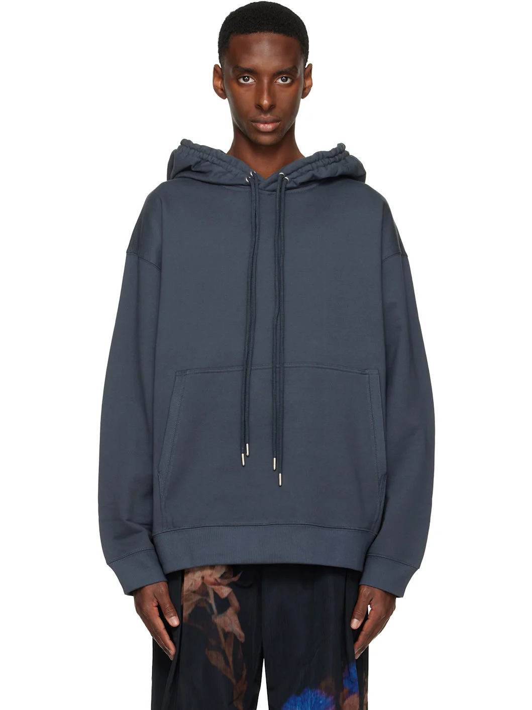 Heavyweight French terry hoodie. · Drawstrings and ruching at hood · Kangaroo pocket at front · Rib-knit hem and cuffs · Dropped shoulders Supplier color: Navy 100% cotton. Made in Turkey 252358M202011