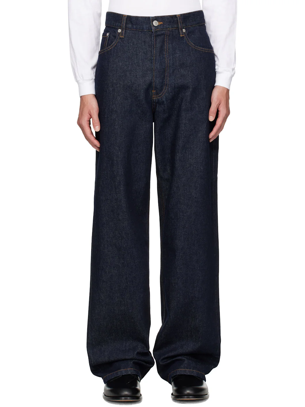 Non-stretch denim jeans. · Loose-fit · Belt loops · Five-pocket styling · Button fly · Pinched leather logo patch at back waistband · Logo-engraved silver-tone hardware · Contrast stitching in tan Supplier color: Indigo 100% cotton. Made in Tunisia 252358M186018