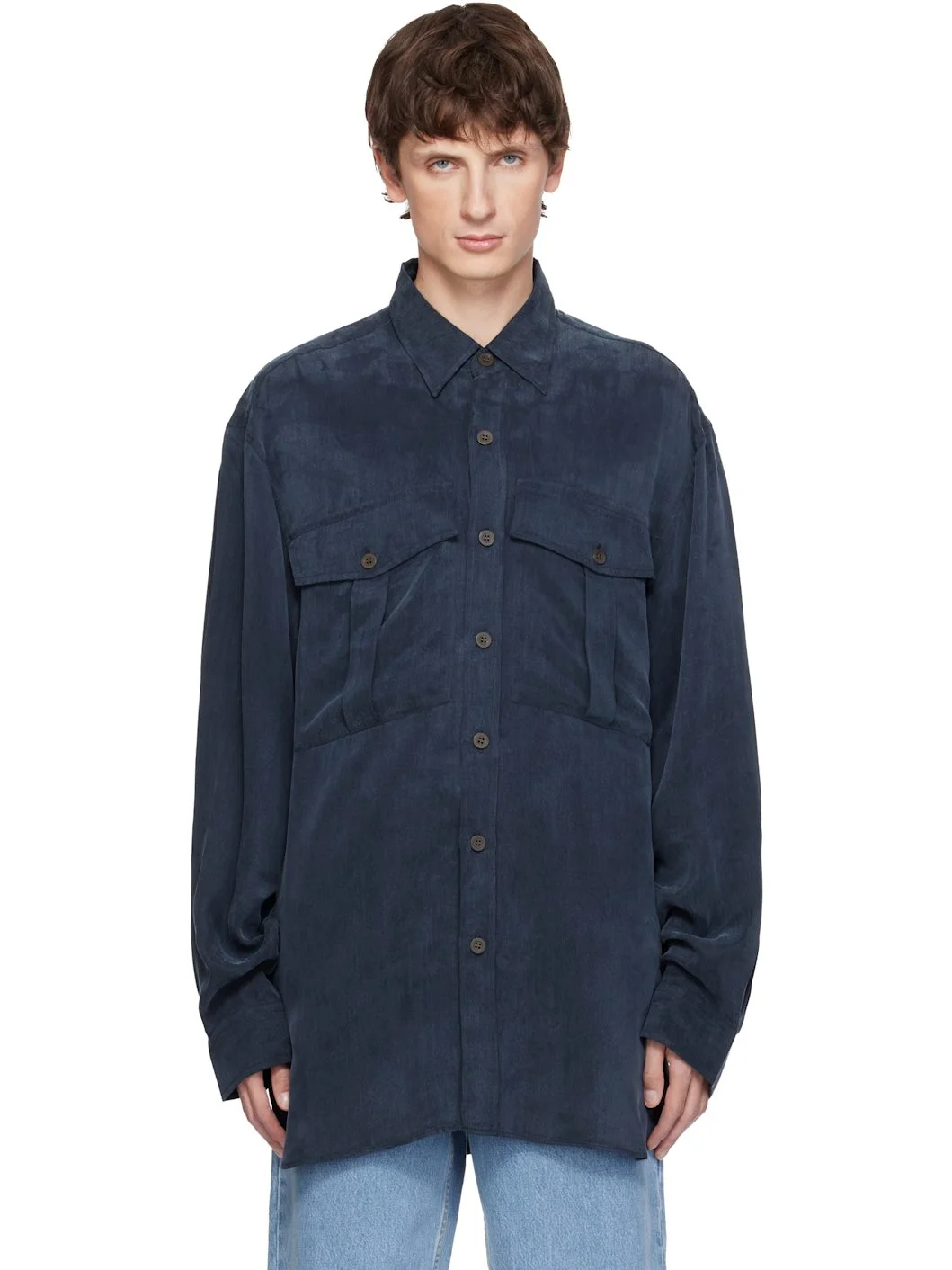 Oversized cupro satin shirt. · Spread collar · Button closure · Flap pockets at chest · Shirttail hem · Dropped shoulders · Adjustable buttoned barrel cuffs Supplier color: Navy 100% cupro. Made in Portugal 252358M192030