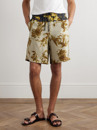 Dries Van Noten's Creative Director Julian Klausner shares the same love for flowers as the brand's founder. Taking cues from basketball styles, these shorts are cut from fluid silk-satin in a wide-leg profile and printed with painterly nerines. Size & Fit - Fits true to size. Take your normal size - Wide leg, low-crotch style - Adjustable at the waist - Lightweight, slightly stretchy fabric - Model is shown wearing an IT 48 - Model measures: waist size 32, height 6'2"/ 188cm Details & Care - Beige and gold satin - 100% viscose - Dry clean