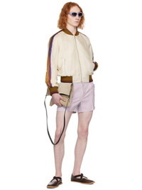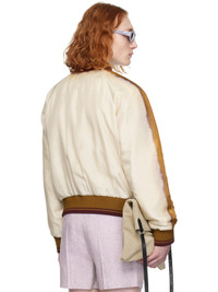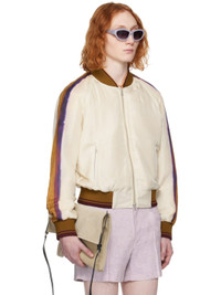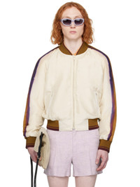 Silk satin bomber jacket. Graphic pattern printed throughout. · Rib knit band collar, hem, and cuffs · Two-way zip closure · Zip pockets · Raglan sleeves · Fully lined Supplier color: Ecru