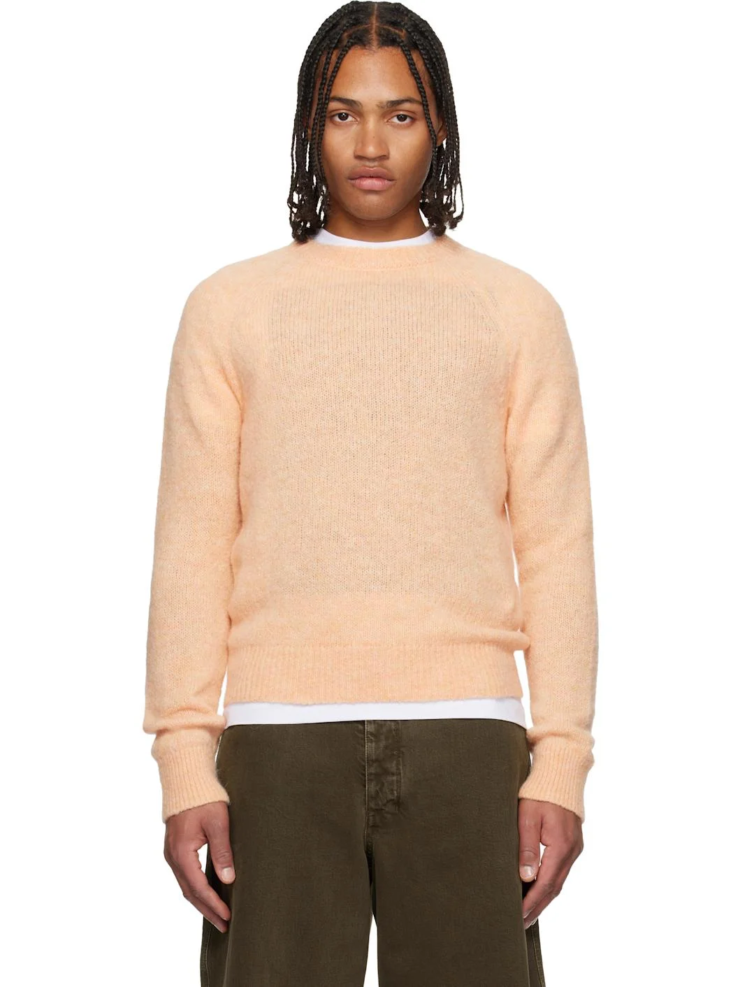 Brushed knit alpaca- and merino wool-blend sweater. · Rib-knit crewneck, hem, and cuffs · Raglan sleeves Supplier color: Peach 60% alpaca, 25% merino wool, 15% nylon. Made in Belgium 252358M201016