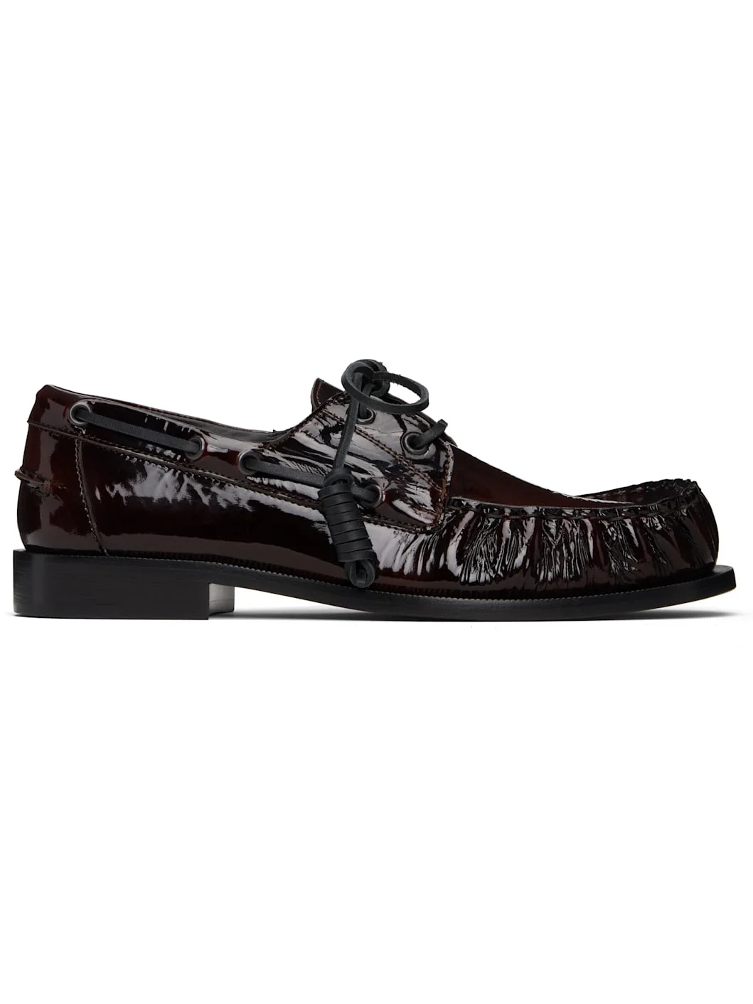 Patent leather boat shoes. · Moc toe · Lace-up closure · Pinched seam at heel counter · Buffed leather lining · Stacked leather heel with rubber injection · Leather sole with rubber injection Supplier color: Dark brown Upper: leather. Sole: leather, rubber. Made in Italy 252358M231000