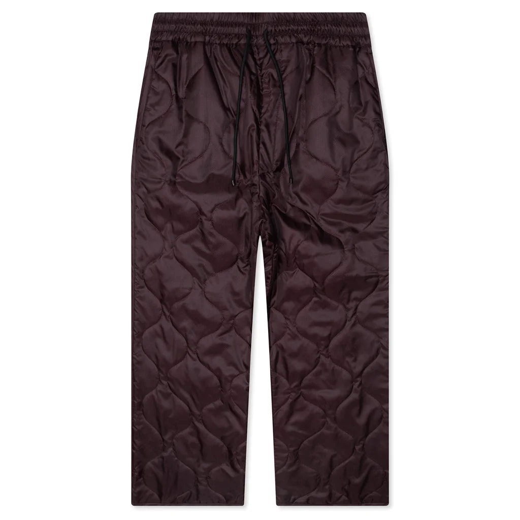 The Pleaded Padded Pants in Auburn, are quilted ripstop pants designed for both style and functionality. Featuring side slit pockets and a back zip pocket, and an elasticated waistband with a drawstring for a customized fit and maximum comfort. - 69% Nylon, 31% Polyester - Side slit pockets & back zip pocket - Elasticated waistband with drawstring - Quilted Nylon - Water Repellant - Style No: 241-020956-8502-357