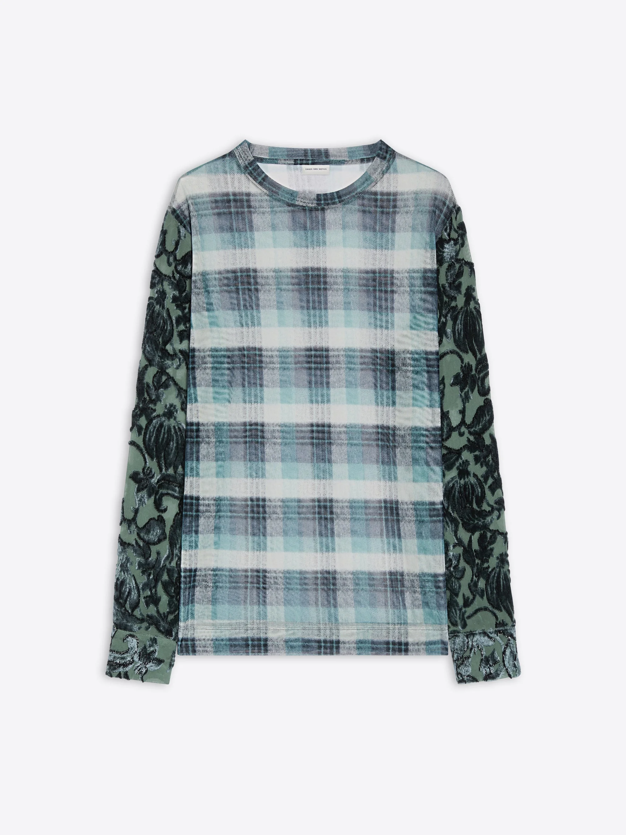Regular fit long-sleeved mesh tee, with contrast check pattern and brocade print. DETAILS - 59% Nylon, 25% Viscose, 12% Silk, 4% Elastane. - Contrast check pattern and brocade print. - Regular fit. Long sleeves. Crew neck. - Ref: 252-021135-2621 SIZE AND FIT Model is 189 cm / 74.5 inches and wears size M.
