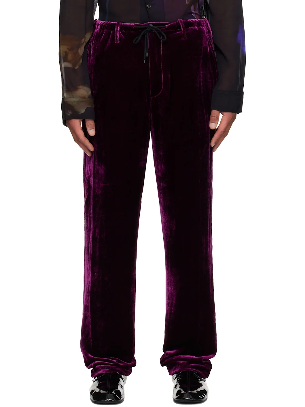 Viscose- and silk-blend velvet trousers. · Straight-leg · Mid-rise · Drawstring at partially elasticized waistband · Belt loops · Three-pocket styling · Zip fly Supplier color: Violet 80% viscose, 20% silk. Made in Tunisia 252358M191050