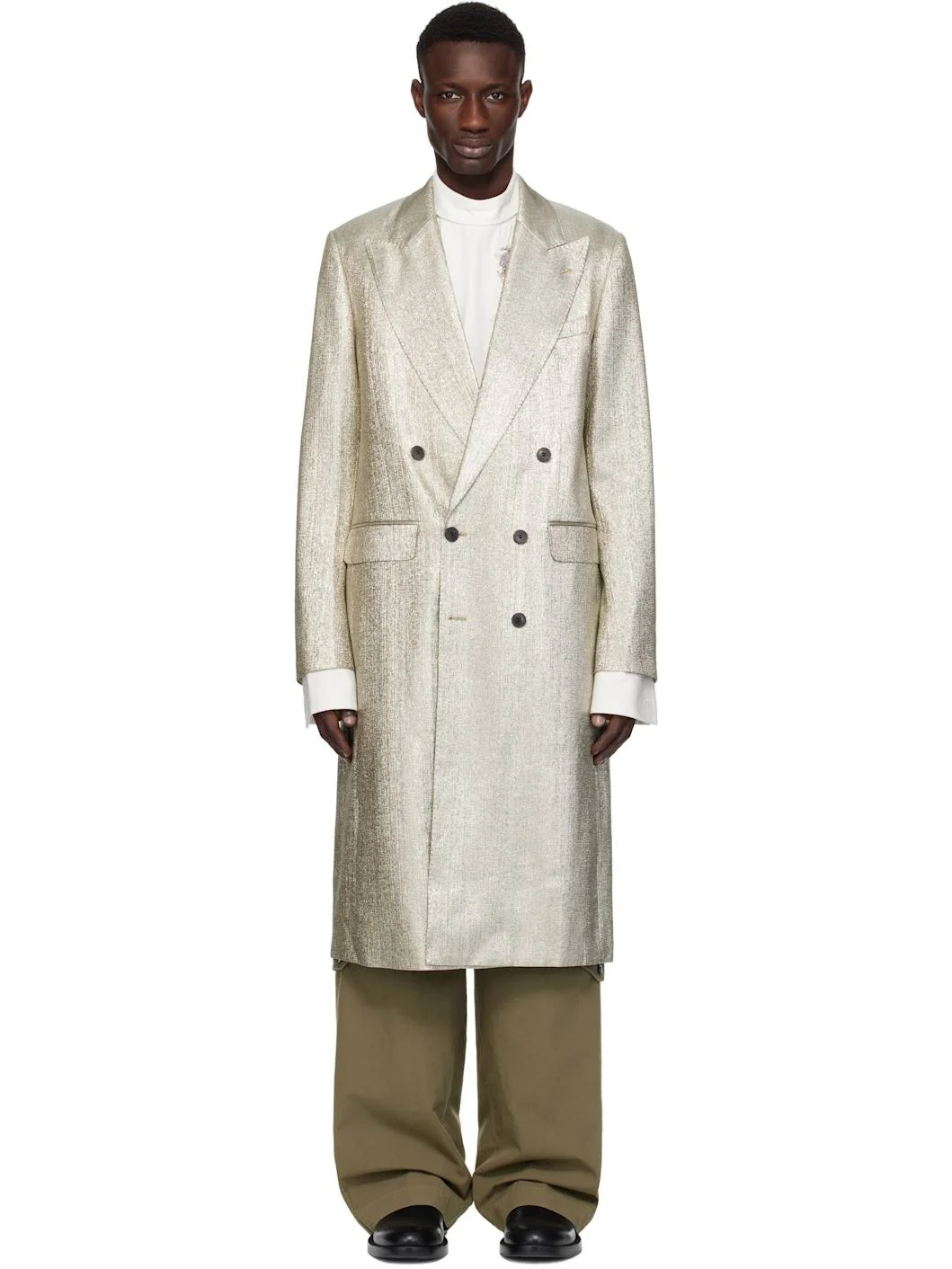 Plain-woven viscose- and nylon-blend lame coat. · Peaked lapel · Double-breasted button closure · Welt pocket · Flap pockets · Surgeon's cuffs · Central vent at back hem · Welt pocket at interior · Full satin lining Supplier color: Silver Body: 80% viscose, 20% polyamide. Lining: 100% viscose. Made in Morocco 251358M176040