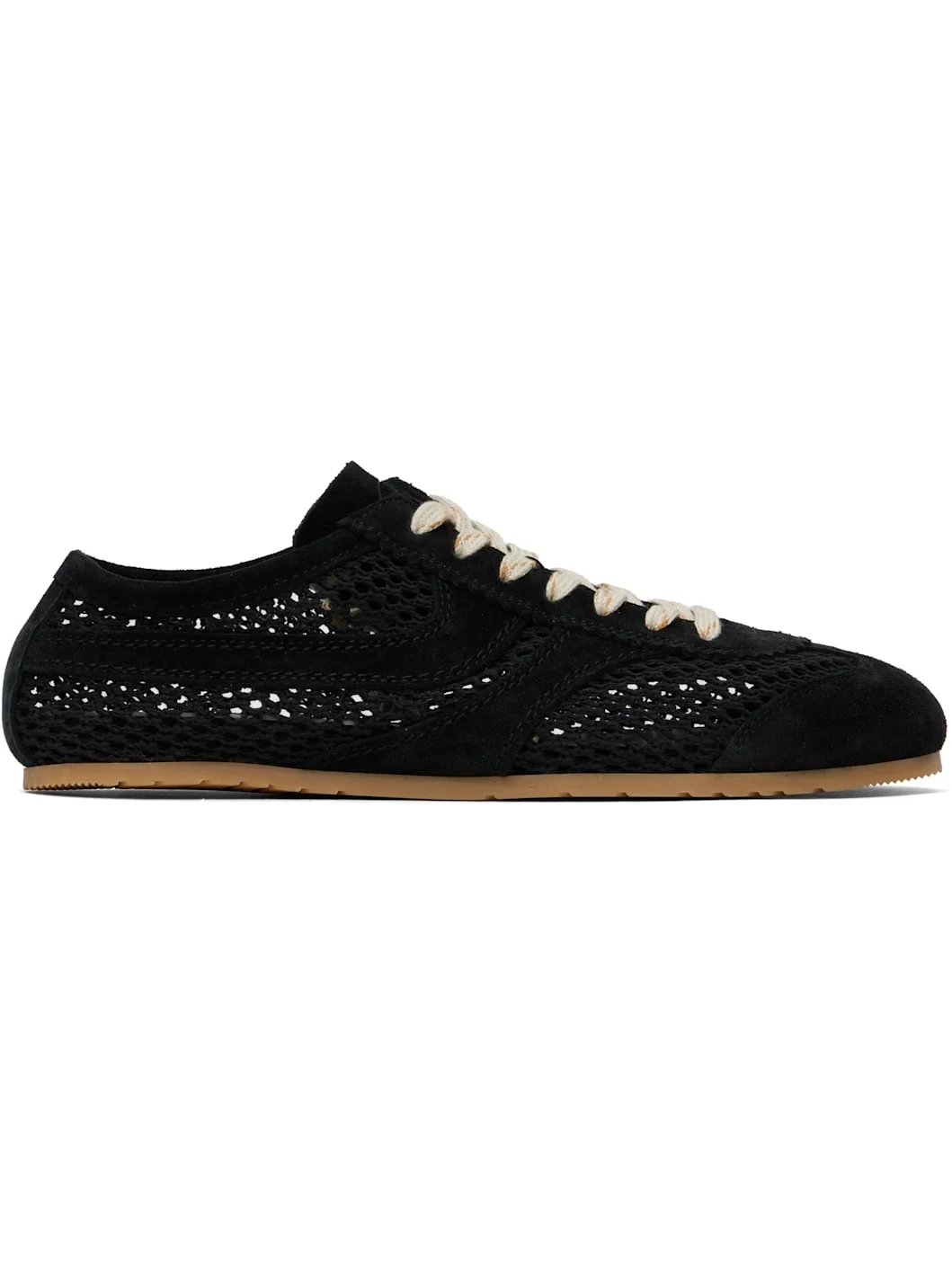 Low-top nappa calfskin suede and mesh sneakers in black. · Lace-up closure · Serrated edge at vamp · Logo embossed at tongue · Stripe appliques at sides · Treaded rubber sole Supplier color: Black Upper: calfskin, textile. Sole: rubber. Made in Italy 251358M237000