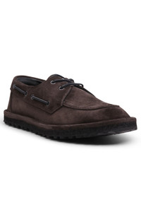 These Suede Lace Up Shoes with rubber soles boast laced trims and metal eyelets, plus a round moc-toe and lace-up closure. Notable features include a rivet and lace-up detailing at the collar, a padded collar, a buffed leather lining, and topstitching at the welt. Fabrication: 100% Suede Leather Size and Fit Fits true to size Italian Sizing Model is wearing a size IT43