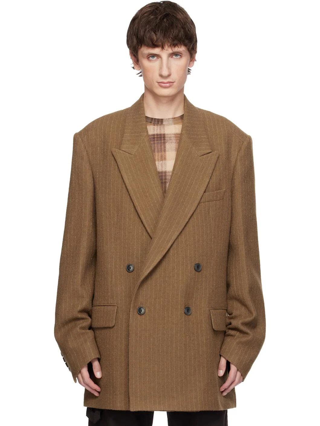 Wool melton blazer. · Pinstripes throughout · Peaked lapel · Double-breasted button closure · Welt pocket at chest · Flap pockets at waist · Surgeon's cuffs · Welt pocket at interior · Full satin lining Supplier color: Tan Body: 100% wool. Lining 1: 100% cupro. Lining 2: 100% viscose. Made in Morocco 252358M195025