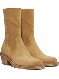 Mid-calf suede boots. · Square toe · Zip closure at inner side · Topstitching at welt · Stacked leather heel with rubber injection · Leather sole with Vibram® rubber injection · Heel: H2.5" Supplier color: Camel Upper: leather. Sole: leather, rubber. Made in Italy 252358M228004