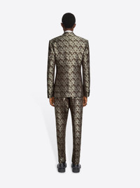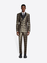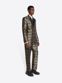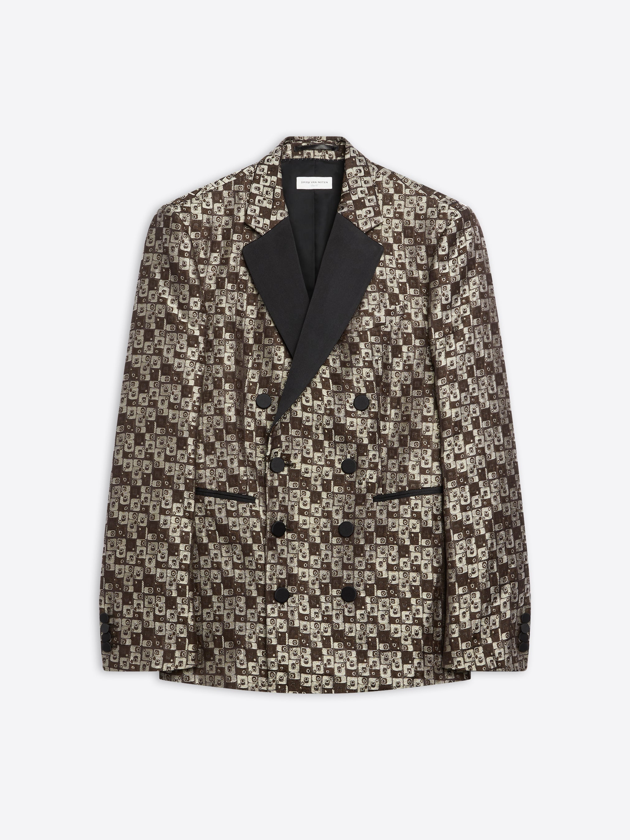 Tight fit tuxedo blazer in jacquard. DETAILS - 59% Viscose, 20% Linen, 15% Polyester, 6% Silk. Lining: 100% Cupro. - Jacquard. - Tight fit. Double-breasted. Front welt pockets. Buttoned cuffs. Single vent. Front button closure. - Ref: 232-020413-7373 SIZE AND FIT Model is 188 cm / 74 inches and wears size 46.
