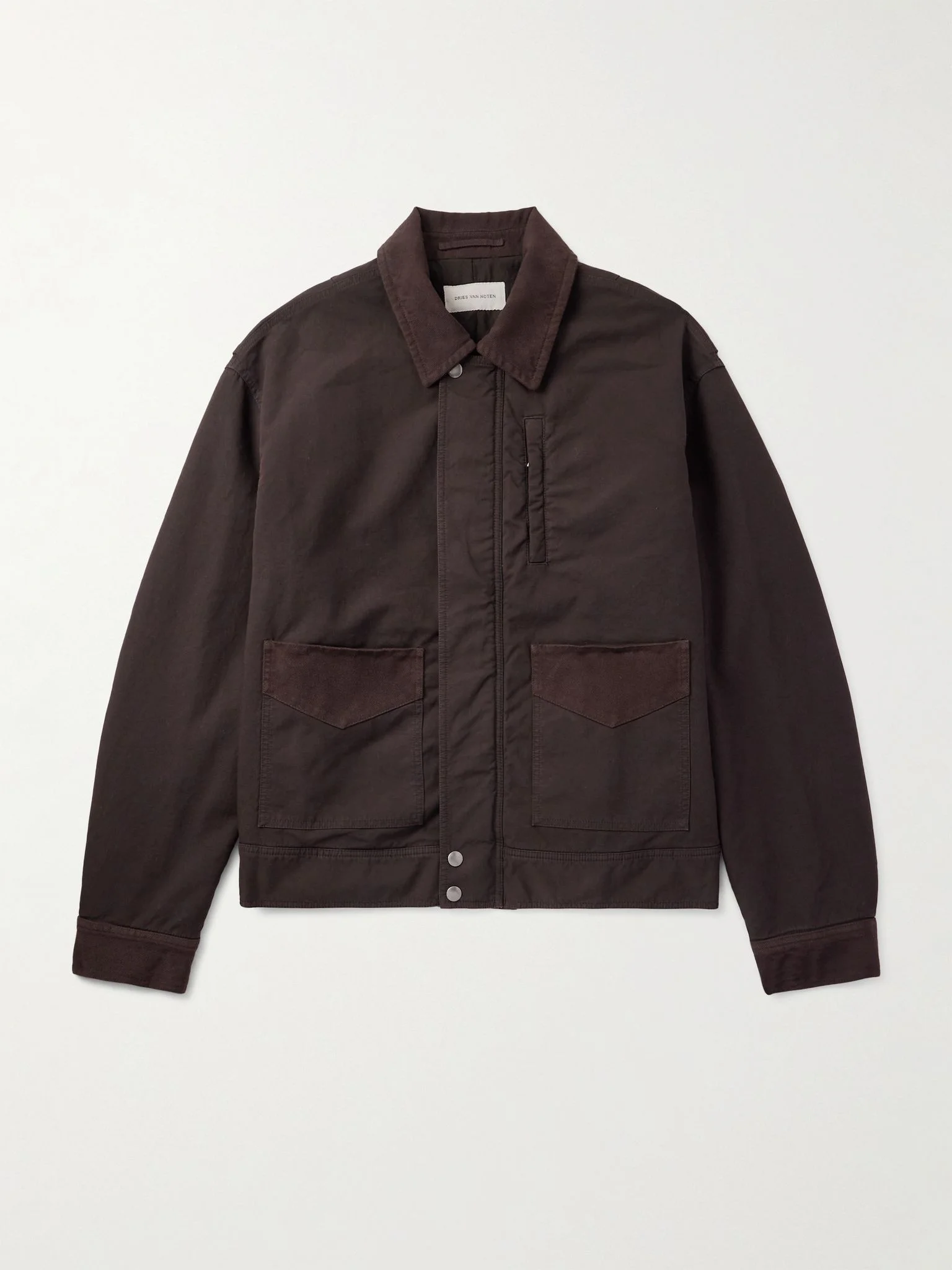 Dries Van Noten's jacket is made from double-weave compact cotton that's overdyed for colour depth. It's trimmed with twill along the collar, pockets and cuffs in a slightly lighter shade of brown. Size & Fit - Model wears a size larger to achieve a looser fit for layering - Mid-weight, non-stretchy fabric - Model is shown wearing a L - Model measures: chest 38"/ 96cm, height 6'2"/ 188cm Details & Care - Tonal-brown cotton and twill - Zip and snap fastening - 100% cotton - Dry clean