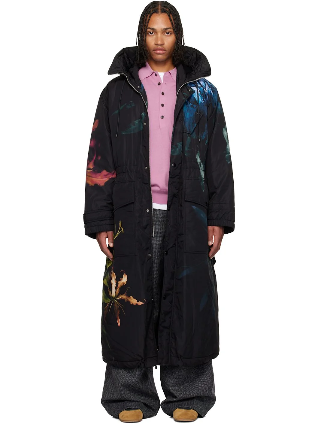 Nylon taffeta parka. · Floral graphics printed throughout · Bungee-style drawstring at hood · Zip closure with press-stud placket · Flap pockets at front · Concealed bungee-style drawstring at waist and hem · Adjustable press-stud tab at cuffs · Central vent at back hem · Welt pocket at interior · Full quilted twill lining Supplier color: Black 100% polyamide. Made in Hungary 252358M176001