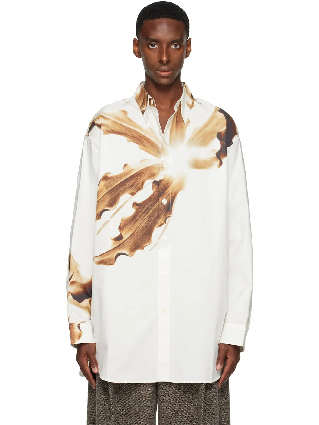 Cotton poplin shirt. · Spread collar · Button closure · Graphic printed at front and sleeves · Shirttail hem · Dropped shoulders · Adjustable buttoned barrel cuffs · Central seam at back Supplier color: Tan 100% cotton. Made in Tunisia 252358M192060