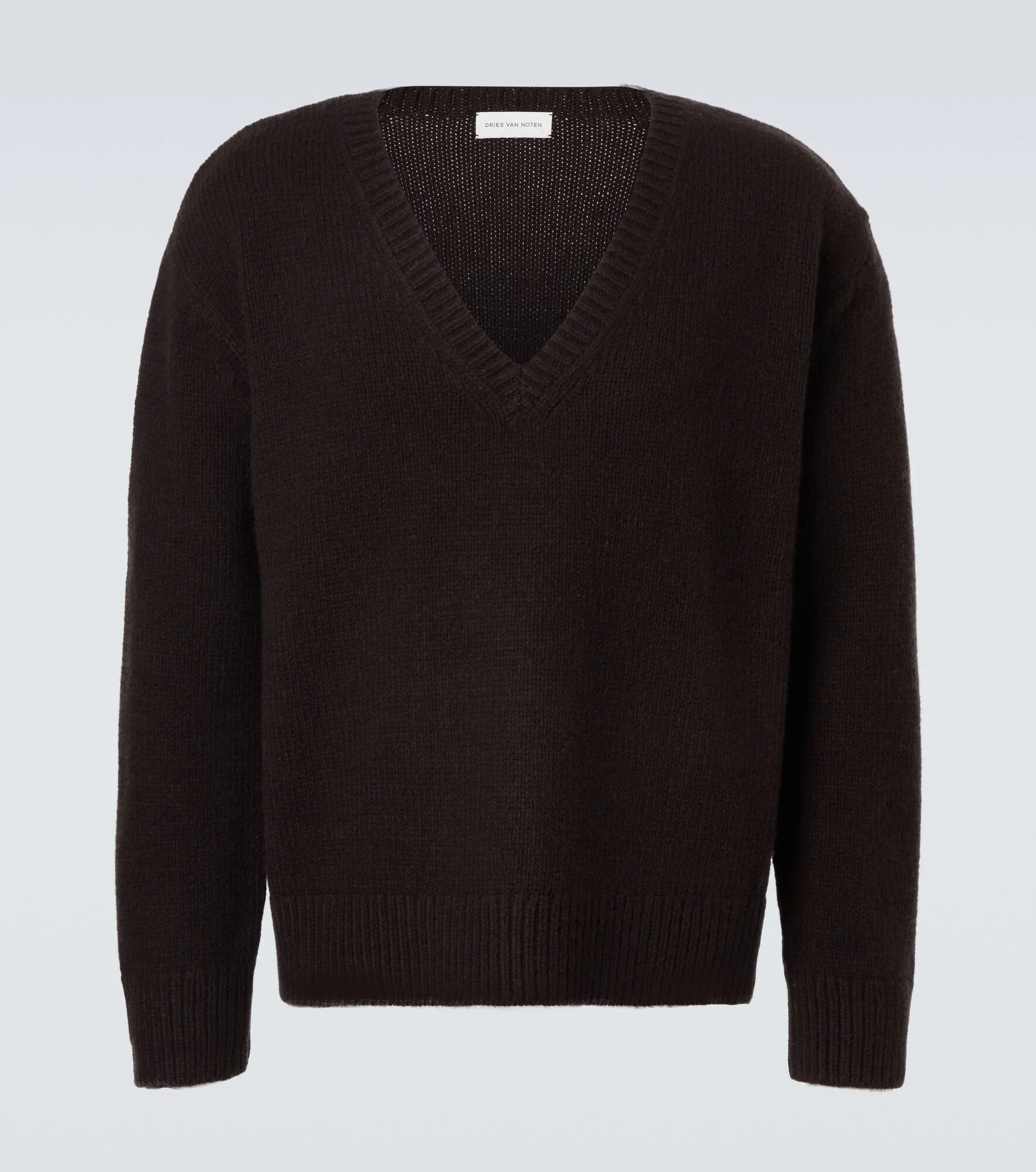 This sweater from Dries Van Noten is crafted from ultra-soft wool and cashmere. The cozy design features a charming V-neckline with ribbed trims. Product Details - Material: 90% wool, 10% cashmere - Care instructions: hand wash - Made in China - Designer color name: Dark Brown - Item color: brown - Collar: V-neck - Cuff: ribbed - Hem: ribbed - Item number: P01086462 Size & Fit - True to size - Dropped shoulders - Designed for a loose fit - Slightly stretchy fabric - Falls to the hip - Height of model is 189cm-74.5" and wears a size L