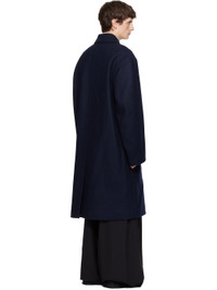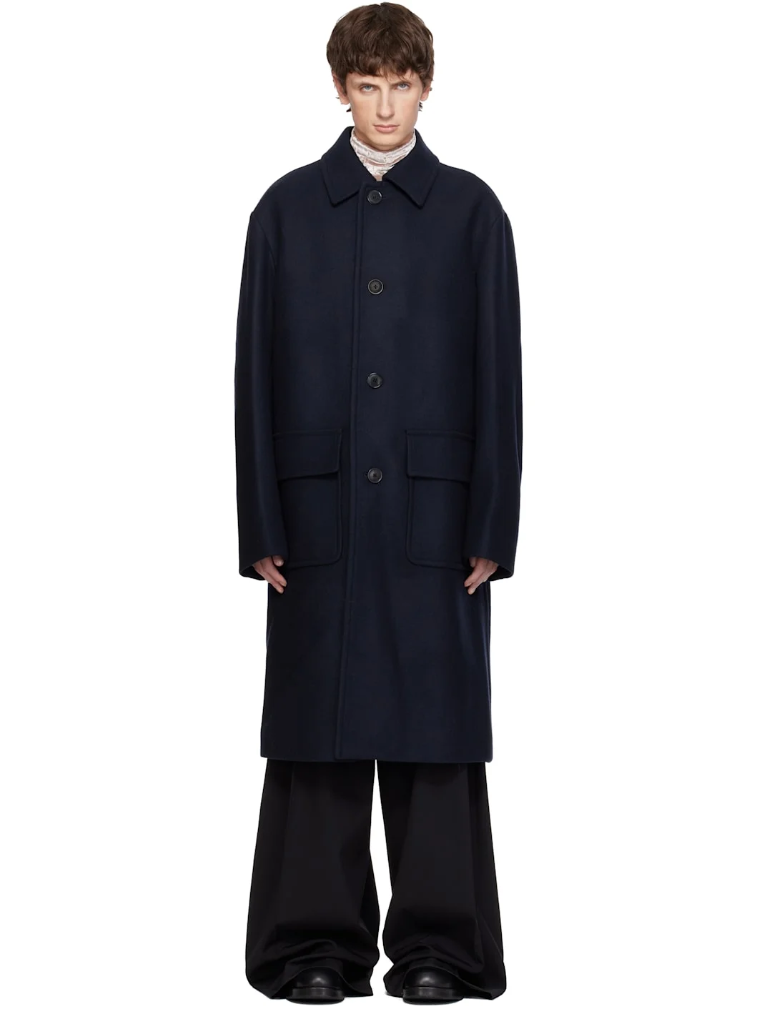 Wool- and nylon-blend melton coat. · Spread collar · Button closure · Flap pockets at waist · Central vent at back hem · Welt pockets at interior · Full satin lining Supplier color: Navy Body: 70% wool, 30% polyamide. Lining: 60% cupro, 40% cotton. Made in Romania 252358M176035