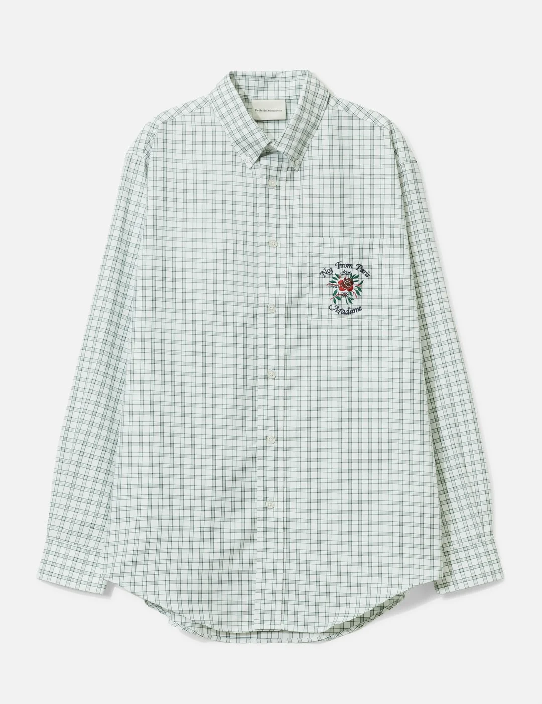 - Drole de Monsieur - Chemise Carreaux Slogan Rose - Checked pattern - American-style button placket - Long sleeve - Back yoke - Chest patch pocket with Slogan Rose embroidery - Buttoned cuffs - Shirttail hem - Engraved buttons on the front - Made in Portugal - Color: Green - Material: 100% Cotton - See more Shirts and Clothing - Model wears size M - Model measures: Height 189cm, Chest 33”/84cm, Waist 27”/68.6cm, Hip 36”/91.4cm - Vendor Code: J-SH240-CO228-GN