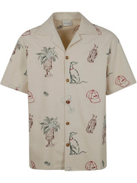 La Chemise Brodee Country Club by Drole De Monsieur in ecru features a front button closure, camp collar, short sleeves, and an all-over graphic print. Made from a 50/50 cotton and polyester blend.