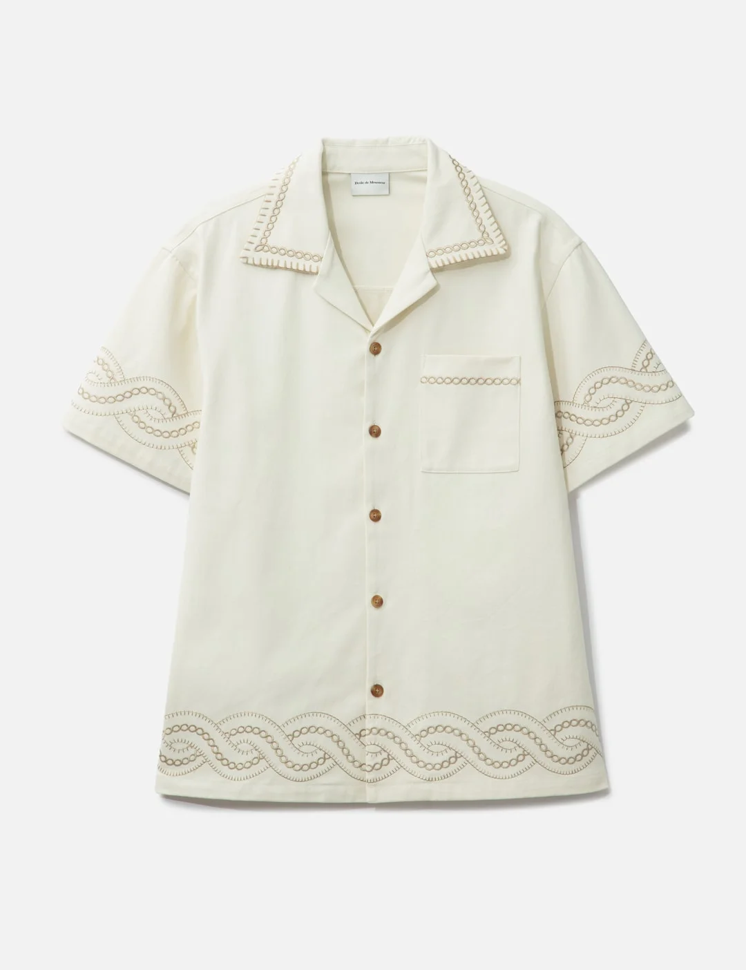 - Drole de Monsieur - La Chemise Brodee Tresses - Made of cotton - Loose fit - Cuban collar - Chest patch pocket with braided embroidery - Short sleeves - Braided embroidery on collar, sleeve hems, and bottom hem - 5 front resin buttons - Color: Cream - Material: 100% Cotton - See more Shirts and Clothing - Model wears size M - Model measures: Height 186cm, Chest 34”/86cm, Waist 28”/71cm, Hip 36”/91cm - Vendor Code: H-SH227-CO215-CM