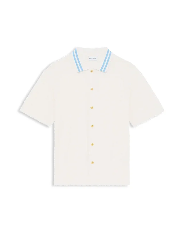 600078389OWT00L / J-SH221-CO201-OW/00/OW - Contrast blue collar trim - Gold-tone button front closure - Short sleeves - Classic collar construction - Premium cotton fabrication - Relaxed fit - French craftsmanship The Drole de Monsieur Chemise Monogramme delivers French elegance with contemporary tailoring and refined detailing. Crafted from premium cotton with contrast blue collar trim and gold-tone button detailing throughout the front placket. The relaxed silhouette and signature monogramme aesthetic create a sophisticated statement piece for modern wardrobes.