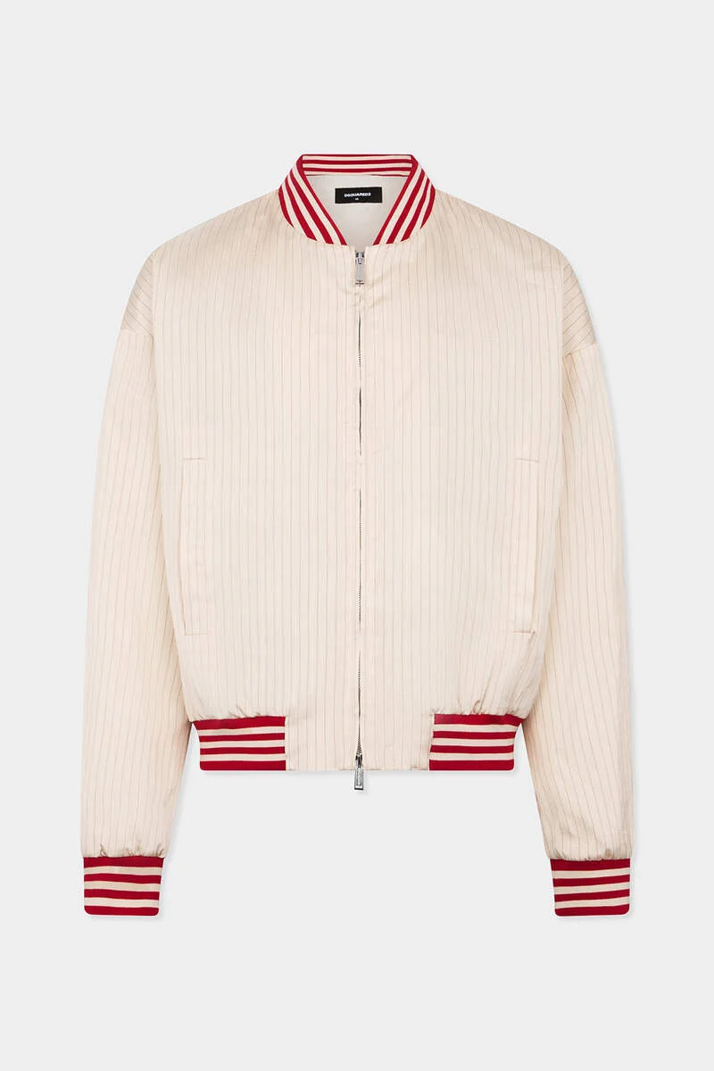 - PRODUCT ID : S71AN0665D35478001F - MADE FROM SILK BLEND - STRIPED PATTERN - BOMBER NECK - TWO-WAY ZIP CLOSURE - OBLIQUE POCKETS - BACK PRINT PRIMARY FABRIC: 86% VISCOSE-RAYON, 14% SILK; LINING: 97% COTTON, 3% ELASTANE-SPANDEX; SLEEVE LINING: 60% VISCOSE-RAYON, 40% POLYESTER; POCKET LINING: 100% COTTON Step back into the '80s with this bold baseball bomber zip-up. Designed with standout stripes, it brings effortless retro cool to any outfit. Pair it with fresh sneakers, your go-to shorts, and a classic vest top for the ultimate laid-back, vintage-inspired look.