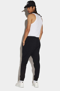 - PRODUCT ID: S79KA0045S25516965 - COTTON FLEECE TROUSERS - TAPERED FIT - ELASTICATED WAISTBAND - SIDE POCKETS - ELASTICATED ANKLE CUFFS - "DSQUARED2 ICON" PRINT - MADE IN ITALY PRIMARY FABRIC: 100% COTTON. SECONDARY FABRIC: 99% COTTON, 1% ELASTANE-SPANDEX. POCKET LINING: 100% POLYESTER Rock the urban vibe in these sleek and stylish Dsquared2 men's joggers. Crafted from premium black fabric, these joggers boast a relaxed, slouchy fit around the waist and upper legs, tapering down to a more fitted silhouette below the knee. With a low-crotched design and two convenient side pockets, these joggers are perfect for everyday wear. Plus, the bold white "ICON" print on the lower left leg adds a touch of edgy attitude. Upgrade your casual wardrobe with these must-have joggers.