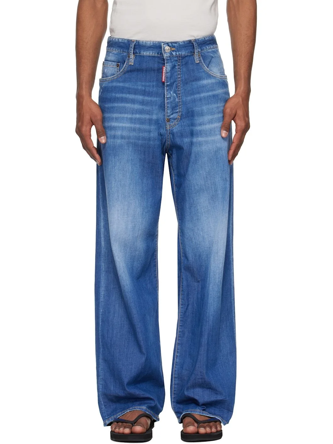 Loose-fit stretch denim jeans. Fading, whiskering, and subtle distressing throughout. · Belt loops · Five-pocket styling · Logo flag at button fly · Logo and text embroidered at back pocket · Logo-engraved silver- and copper-tone hardware · Contrast stitching in tan Part of the Summer Lovers capsule collection. Supplier color: Blue 98% cotton, 2% elastane. Made in Italy 252148M186000