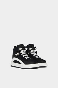 Add some attitude to your shoe collection with these chunky, high-top Dsquared2 men's sneakers. The round and wide toe box adds a unique and eye-catching touch, while the upper features contrasting colours with a distinctive swoosh shaped eyelet. The tongue features statement branding with a "24 seven" graphic print, adding a touch of personality to these shoes. Pair these sneakers with distressed jeans and a graphic t-shirt for a casual, street-style look.