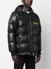 chest logo-print padded jacket jet black feather down padded design logo print at the chest classic hood front zip fastening long sleeves front zip fastening pockets cotton lining Imported Composition Lining: Cotton 100%, Polyamide 100%, Down 80%, Feather 20% Outer: Polyamide 100% SIZE & FIT Model measurements Height 6 ft 2 in(1.87 m) Bust/Chest 36.41 in(92.5 cm) Hips 37 in(94 cm) Waist 29.52 in(75 cm) FittingInformation This piece fits true to size. We recommend you get your regular size Cut for a loose fit Made with a mid-weight non-stretch fabric Washing instructions Dry Clean Only