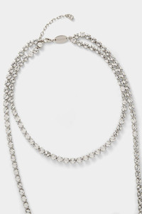 - PRODUCT ID : NEM030759400001M1319UN - METAL CHAIN NECKLACE - CLAW-SET RHINESTONES - LONG SIDE STRANDS - ADJUSTABLE LOBSTER CLASP STRUCT: 5% TIN ALLOY, 60% BRASS, 35% CRYSTAL Elevate your eveningwear game with this statement rhinestone necklace, caressing the neck and captivating the eye. Pair it with a sharp tuxedo, sheer shirt or classic crewneck: anything goes.