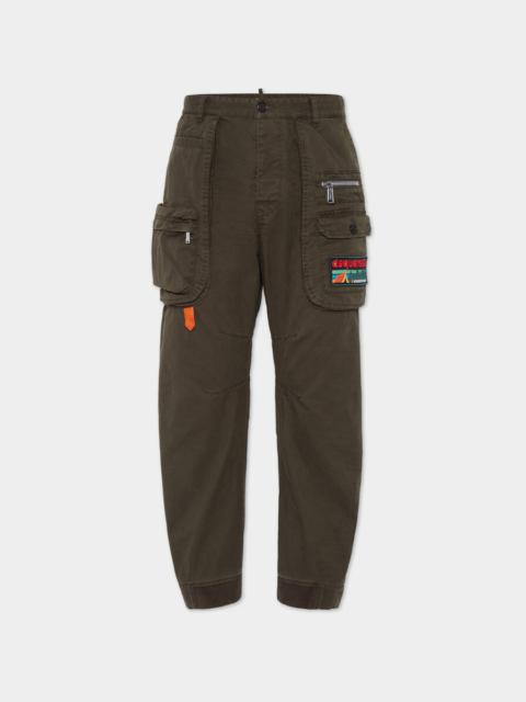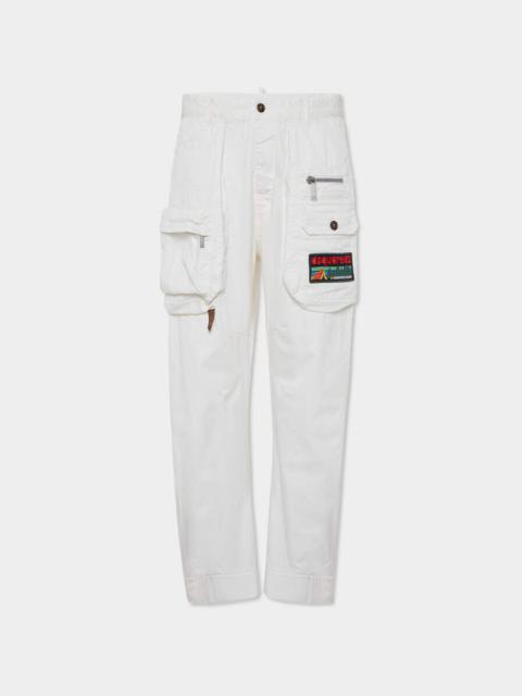 - MADE FROM COTTON TWILL - LOOSE FIT - BOW LEG - WAISTBAND WITH BELT LOOPS - SLANT POCKETS - UTILITY POCKETS - BACK WELT POCKETS - EMBROIDERED DSQUARED2 PATCH PRIMARY FABRIC: 100% COTTON; POCKET LINING: 100% COTTON; APPLICATION: 96% COTTON, 2% POLYAMIDE-NYLON, 2% ELASTANE-SPANDEX; APPLICATION: 95% COTTON, 3% POLYAMIDE-NYLON, 2% ELASTANE-SPANDEX Canadian adventures are calling. These twill trousers are topped with roomy pockets and an embroidered patch that champions Dsquared2's heritage. Go full outdoors and team with combat boots or mocs.