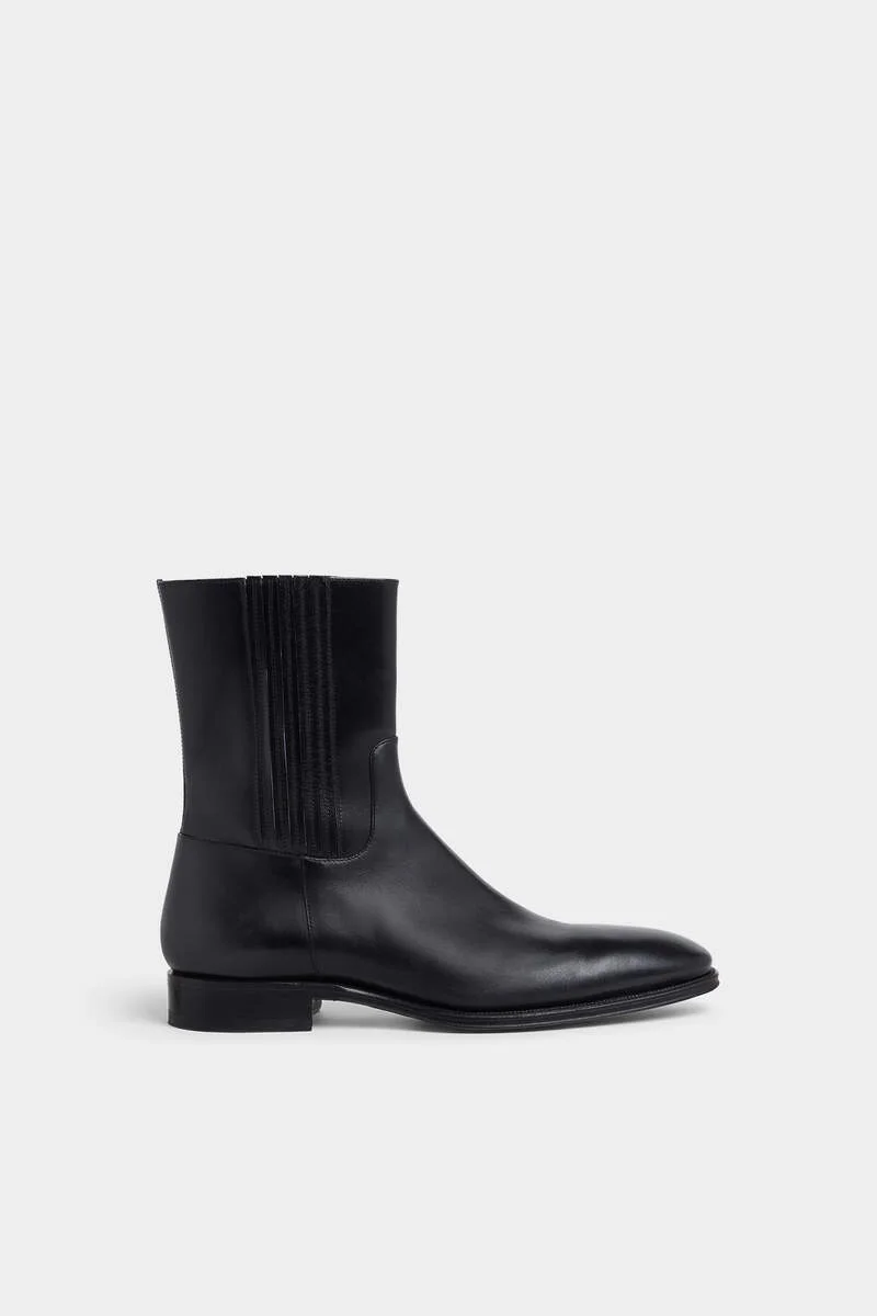 - MADE FROM LEATHER - SIDE STRIP DETAILING - INNER SIDE ZIP - LOW HEEL UPPER: 100% CALFSKIN, LINING: 80% CALFSKIN, 20% POLYESTER; SOLE: 97% LEATHER, 3% RUBBER Keep it sleek in these leather ankle boots, striking the perfect balance between style and practicality with their low chunky heel. Thin strip detailing on the side adds a refined touch, whilst an inner side zip closure makes slipping them on and off a breeze.