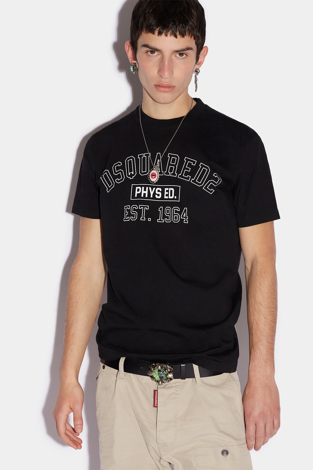 - PRODUCT ID: S71GD1225S23009900 - COTTON JERSEY T-SHIRT - REGULAR FIT - FRONT "DSQUARED2 EST.1964" PRINT - MADE IN ROMANIA 100% COTTON THE MODEL IS 6'2" TALL AND WEARS A SIZE M WORK THE COLLEGE VIBE IN THIS SLIM FIT D2 PHYS. ED. T-SHIRT WITH SHORT SLEEVES. CUT FROM A PLAIN-DYE FABRIC, SIGNED WITH A DSQUARED2 VARSITY PRINT LOGO ON THE FRONT AND A PLAIN BACK. PAIR WITH PAINT-SPLATTERED JEANS TO COMPLETE THE LOOK.
