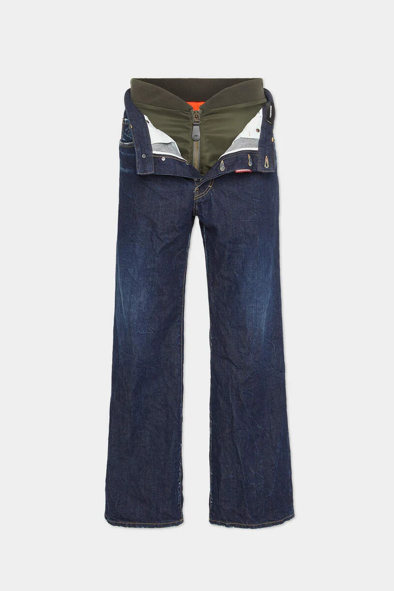 - PRODUCT ID : S71LB1633D30011470 - MADE FROM COTTON DENIM - DARK BLUE WASH - LOOSE FIT - FIVE-POCKET STYLE - BOMBER INSERT - WHISKERING EFFECTS - RED DSQUARED2 LABEL - DSQUARED2 PATCH PRIMARY FABRIC: 100% COTTON Urban attitude where you least expect it: these five-pocket jeans unbutton to reveal a cheeky bomber insert. Detailed with whiskering effects and our signature red Dsquared2 label.